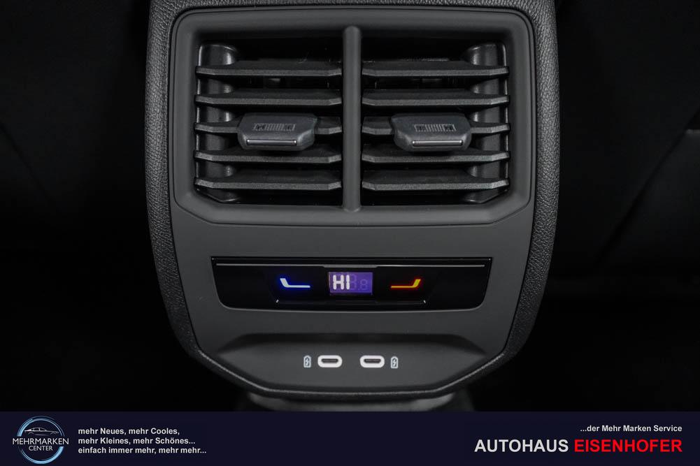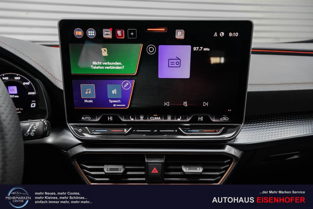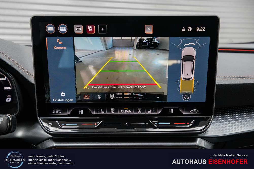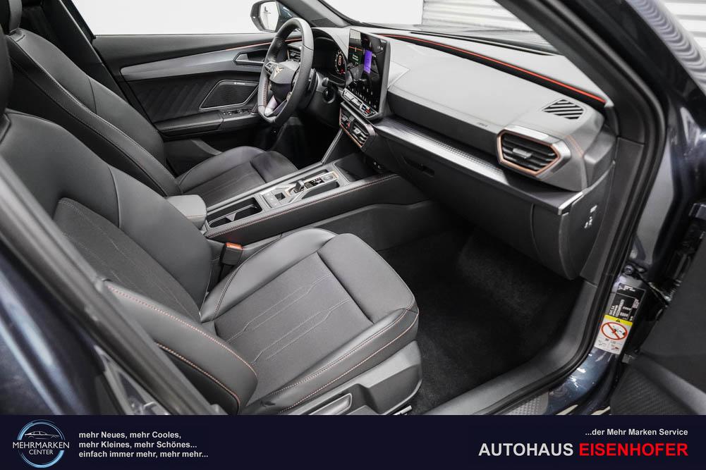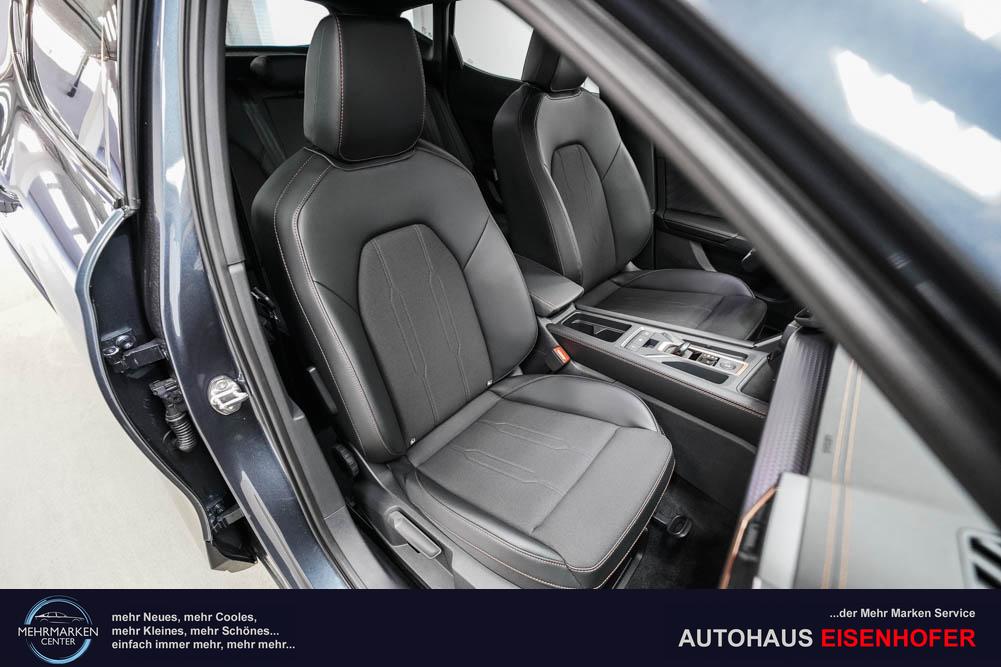 Beifahrersitz höhenverstellbar, Fahrersitz höhenverstellbar, Lederlenkrad, Lendenwirbelstütze, Mittelarmlehne vorne, Sitzbezug Stoff, geteilt umklappbare Rücksitzlehne, Lenkrad höhenverstellbar, Smart Wraparound Interieur Light, Beheizbares Lenkrad, Multifunktionslenkrad, Isofix, Isofix Beifahrersitz, abgedunkelte Scheiben, 18 Zoll Alufelgen , Dachreling schwarz, ABS, Alarmanlage, Außenspiegel elektrisch einstell-/anklappbar, Fensterheber elektrisch, Kopfairbags, Nebelscheinwerfer, Seitenairbags, Servolenkung, Sitzheizung, ESP, Wegfahrsperre, Außenspiegel beheizbar, Beifahrerairbag, Fahrerairbag, Parkpilot hinten, Parkpilot vorne, Reifendruckkontrolle, Regensensor, Lichtsensor, Digital Cockpit, Anhängekupplung schwenkbar, Tempomat Abstand ACC, Spurhalteassistent, Verkehrszeichenerkennung, LED-Scheinwerfer, Tagfahrlicht, Rückfahrkamera, Elektrische Heckklappe inkl. Virtual Pedal, KeylessEntry, StartStopSystem, Innenspiegel automatisch abbl., Müdigkeitswarnsystem, Notrufsystem, Schaltwippen, Klimaautomatik 3-Zonen, Geschwindigkeitsbegrenzer, Android Auto, Apple Carplay, Freisprecheinrichtung, Induktionsladestation, Sprachsteuerung, USB, Radio, Radio DAB, Bluetooth, Bordcomputer, IMMERSIVE by Sennheiser, Cupra Full Link, Full Link, variabler Ladeboden,